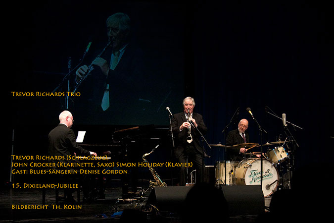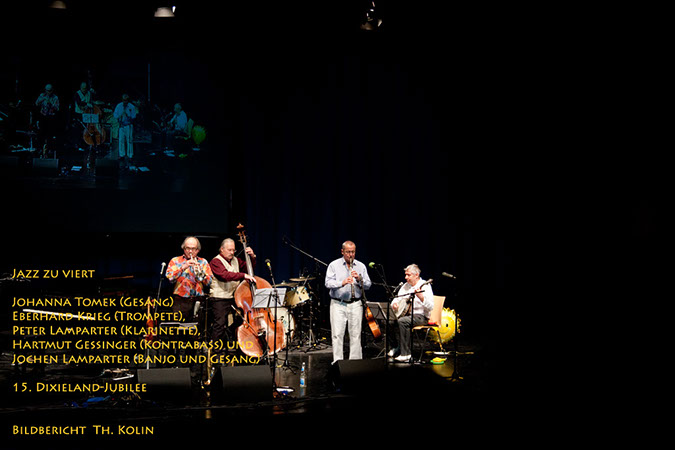 Pressestimme: Gastgeber Gert Nagel erinnerte eingangs an den Beginn der Jazzkonzertreihe 1996 in der Stuttgarter Liederhalle und an die Fortsetzung ab 1998 im Kulturhaus Kornwestheim. Da das Kulturhaus nicht mehr zur Verfügung steht, findet das Jubilee nun im Festsaal der Ludwigsburger Waldorfschule statt. Das 15. Konzert widmete Nagel dem im vergangenen Jahr verstorbenen Verleger und Jazz-Förderer Horst Reichert. Nagels Erfolgsrezept konnte man schon auf dem Programmzettel ablesen: drei ausgesuchte Bands, dazu ausdrucksstarke Gesangssolisten. Dass man auch in kleiner Besetzung fulminanten Jazz machen kann, bewiesen die Ensembles Jazz zu viert und das Trevor Richards Trio. Das aus dem Raum Stuttgart, Ludwigsburg und Kornwestheim kommende, fachkundige Publikum im übervollen Konzertsaal war auf Jazz-Soli erpicht und konnte das Agieren der Musiker auf der großen Video-Wand zusätzlich verfolgen. Temporeich und locker begann Jazz zu viert mit Eberhard Krieg (Trompete), Peter Lamparter (Klarinette), Hartmut Gessinger (Kontrabass) und Jochen Lamparter (Banjo und Gesang). Für das Parallelspiel von Trompete, Klarinette und hämmerndem Banjo gab es Szenenapplaus. Der Trompeter sang in Peter-Igelhof-Manier "Wir singt gut aufgelegt", selbst der Bass wagte ein Solo. Dann hieß es "Somebody Stole My Girl" mit immer neuen Improvisationen - bis zum gegliederten Schluss. |